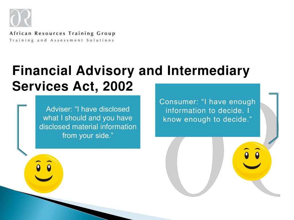 Financial Advisory and Intermediary Services Act, 2002 Consumer: “I have enough information to decide. I know enough to decide.” Adviser: “I have disclosed what I should and you have disclosed material information from your side.”
