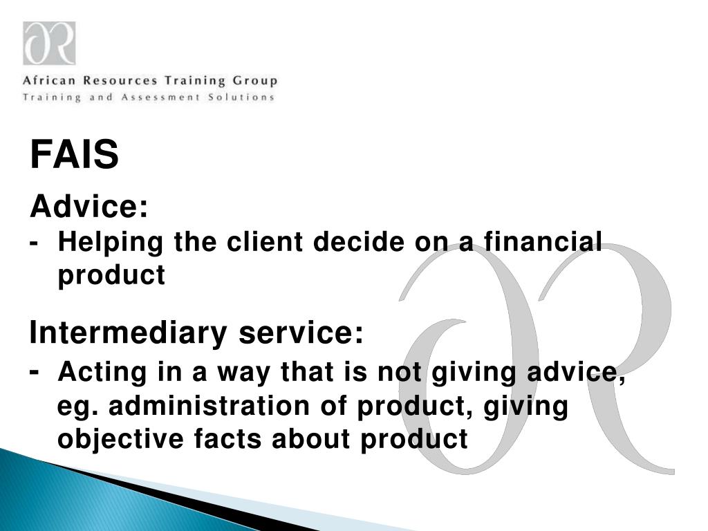 FAIS Advice: - Helping the client decide on a financial product Intermediary service: - Acting in a way that is not giving advice, eg. administration of product, giving objective facts about product