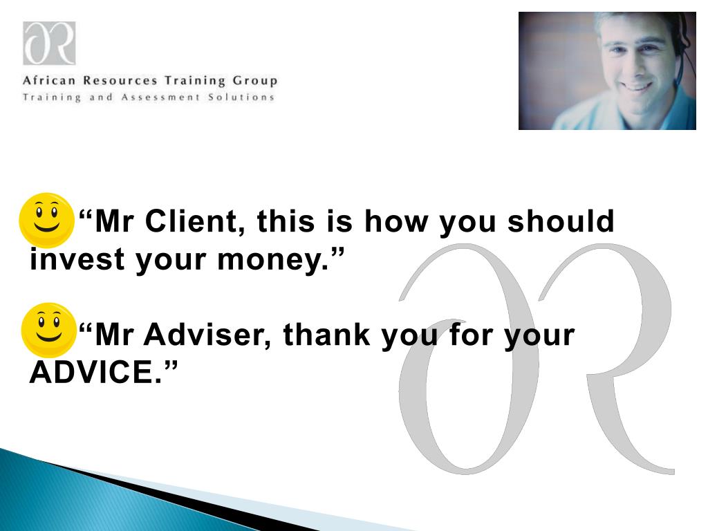“Mr Client, this is how you should invest your money.” “Mr Adviser, thank you for your ADVICE.”