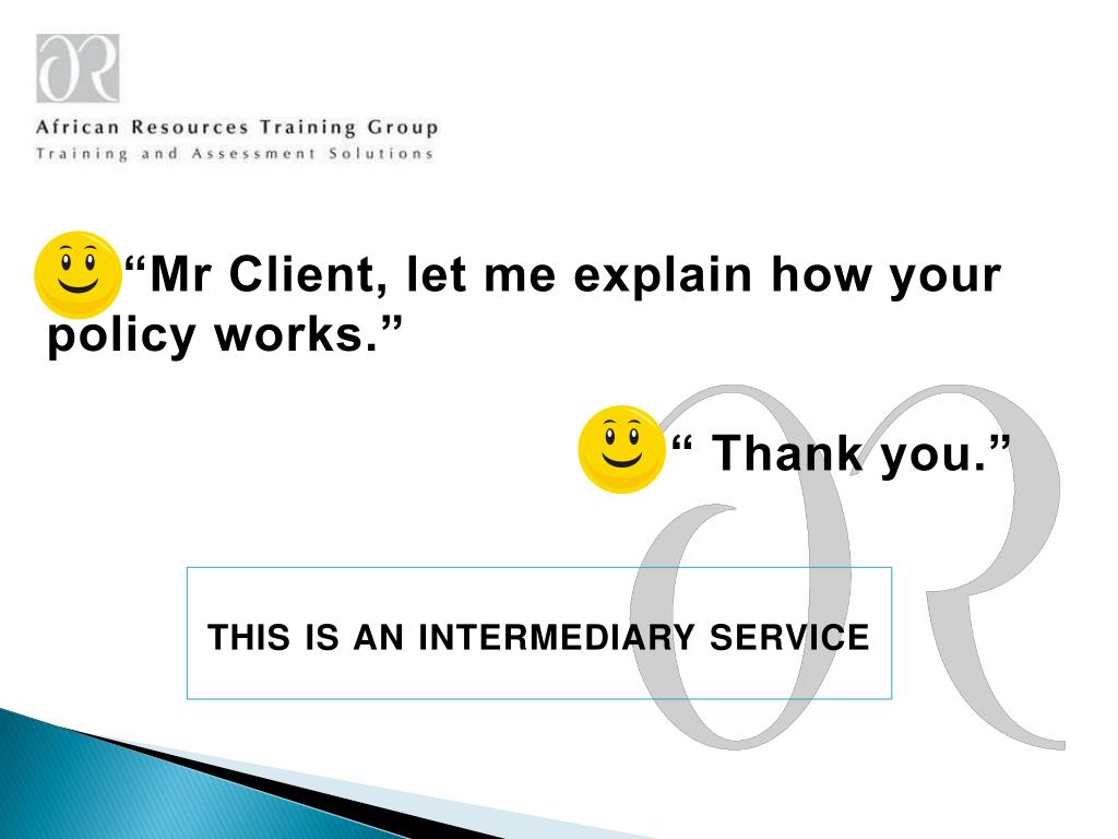 “Mr Client, let me explain how your policy works.” “ Thank you.” this is an intermediary service