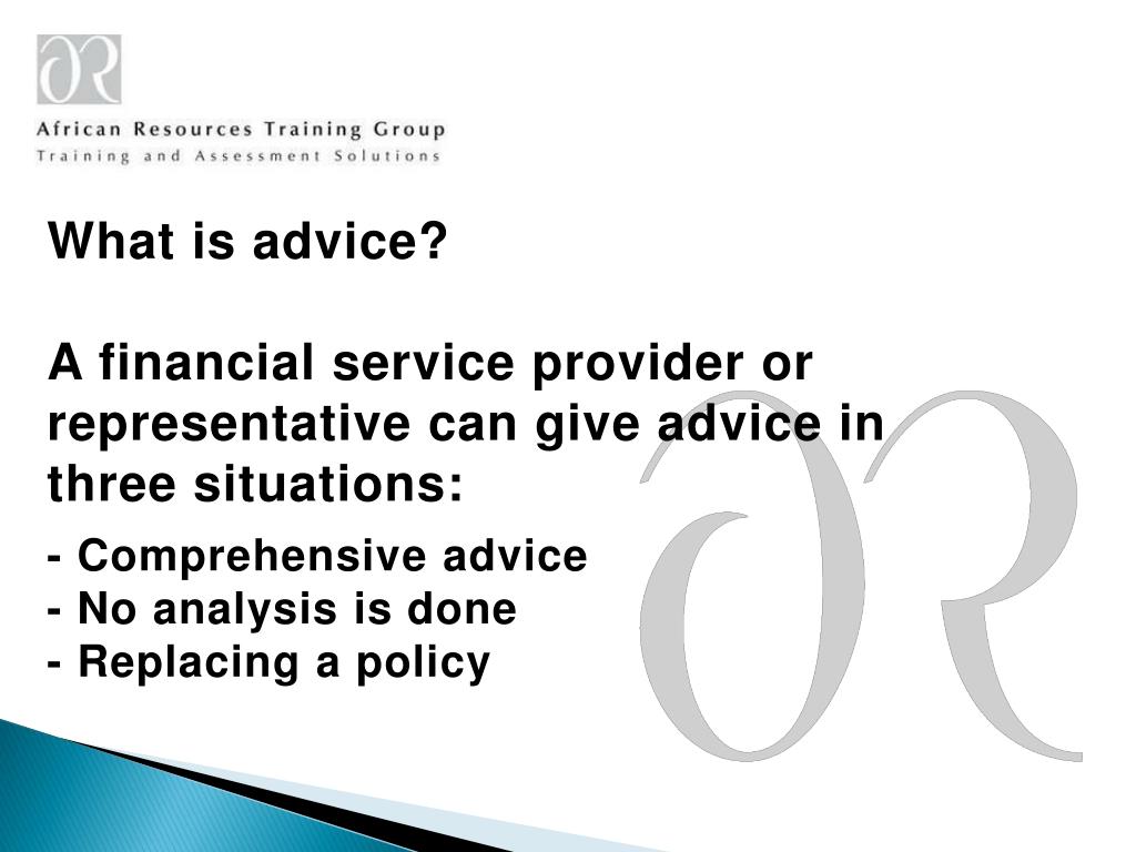 What is advice? A financial service provider or representative can give advice in three situations: - Comprehensive advice - No analysis is done - Replacing a policy