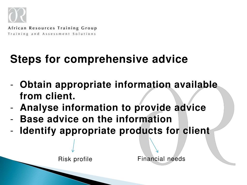 Steps for comprehensive advice • Obtain appropriate information available from client. • Analyse information to provide advice • Base advice on the information • Identify appropriate products for client Financial needs Risk profile