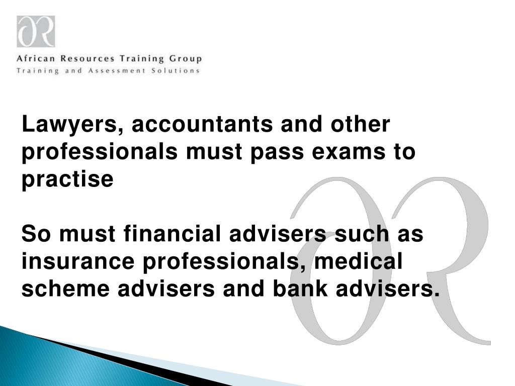 Lawyers, accountants and other professionals must pass exams to practiseSo must financial advisers such as insurance professionals, medical scheme advisers and bank advisers.