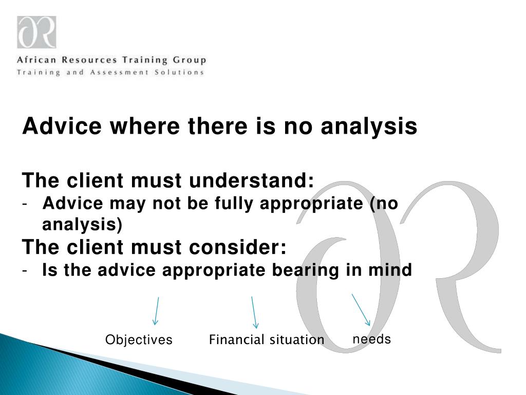 Advice where there is no analysis • The client must understand: • Advice may not be fully appropriate (no analysis) • The client must consider: • Is the advice appropriate bearing in mind needs Objectives Financial situation
