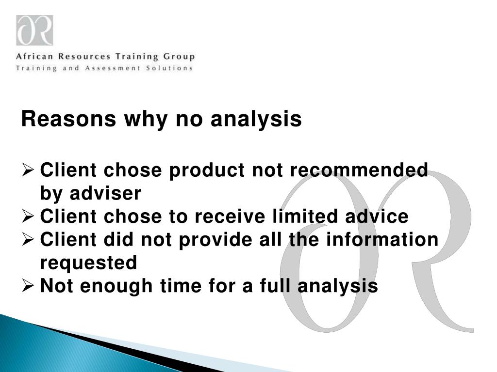 Reasons why no analysis • Client chose product not recommended by adviser • Client chose to receive limited advice • Client did not provide all the information requested • Not enough time for a full analysis
