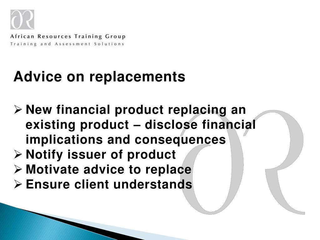 Advice on replacements • New financial product replacing an existing product – disclose financial implications and consequences • Notify issuer of product • Motivate advice to replace • Ensure client understands