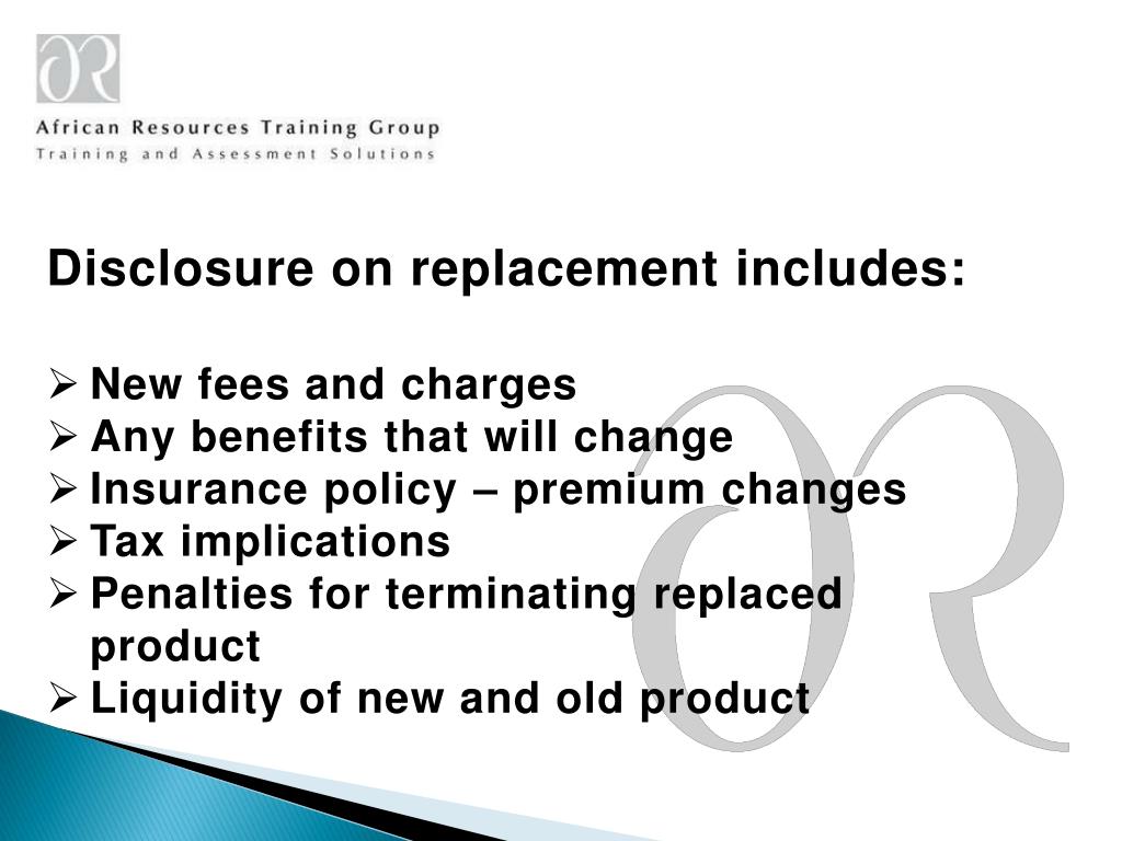 Disclosure on replacement includes: • New fees and charges • Any benefits that will change • Insurance policy – premium changes • Tax implications • Penalties for terminating replaced product • Liquidity of new and old product