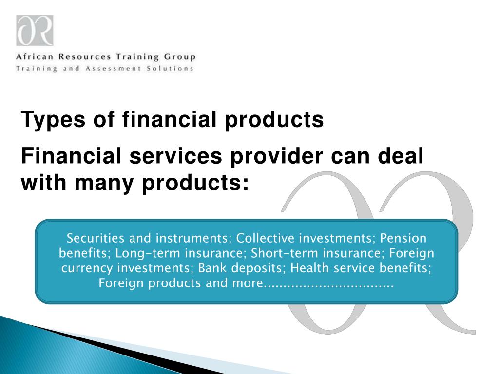 Types of financial products Financial services provider can deal with many products: Securities and instruments; Collective investments; Pension benefits; Long-term insurance; Short-term insurance; Foreign currency investments; Bank deposits; Health service benefits; Foreign products and more.................................