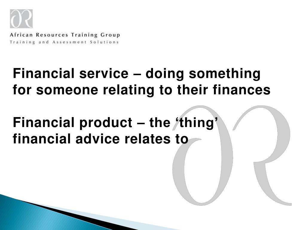 Financial service – doing something for someone relating to their finances Financial product – the ‘thing’ financial advice relates to