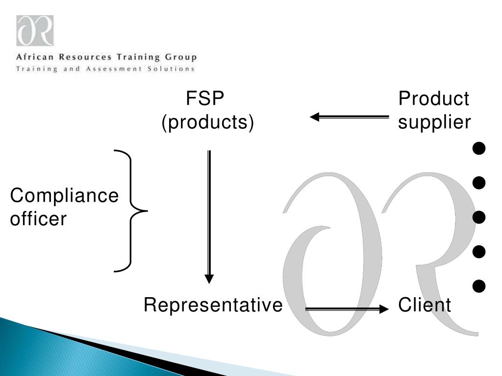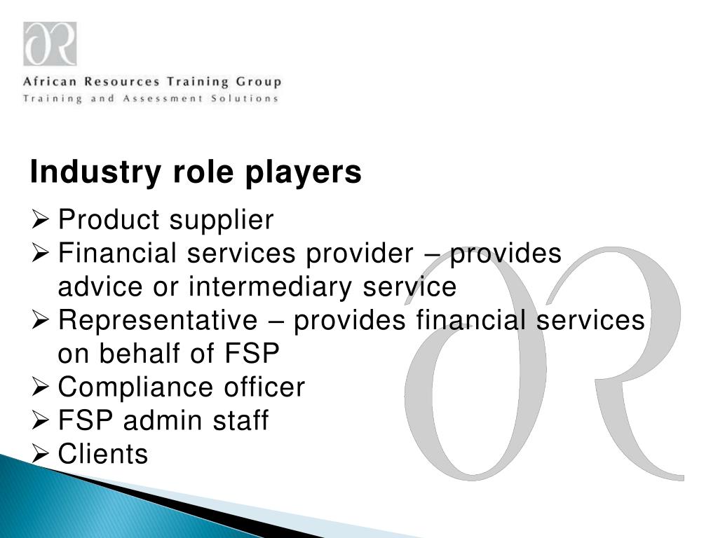 Industry role players • Product supplier • Financial services provider – provides advice or intermediary service • Representative – provides financial services on behalf of FSP • Compliance officer • FSP admin staff • Clients