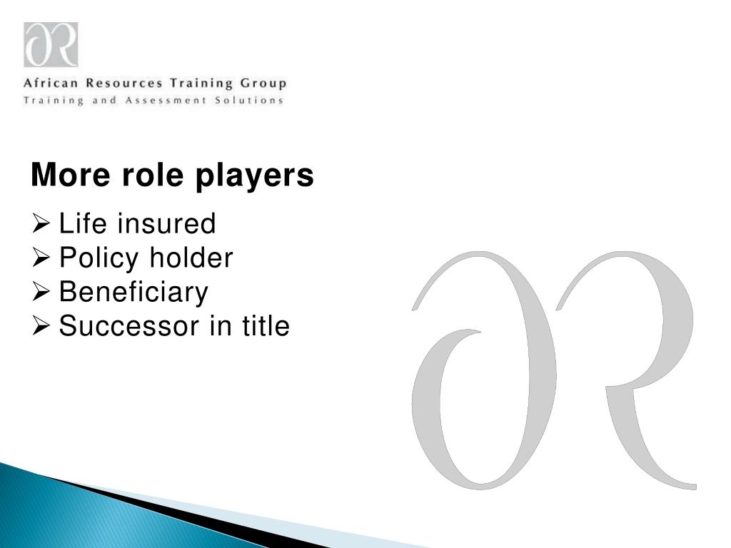 More role players • Life insured • Policy holder • Beneficiary • Successor in title