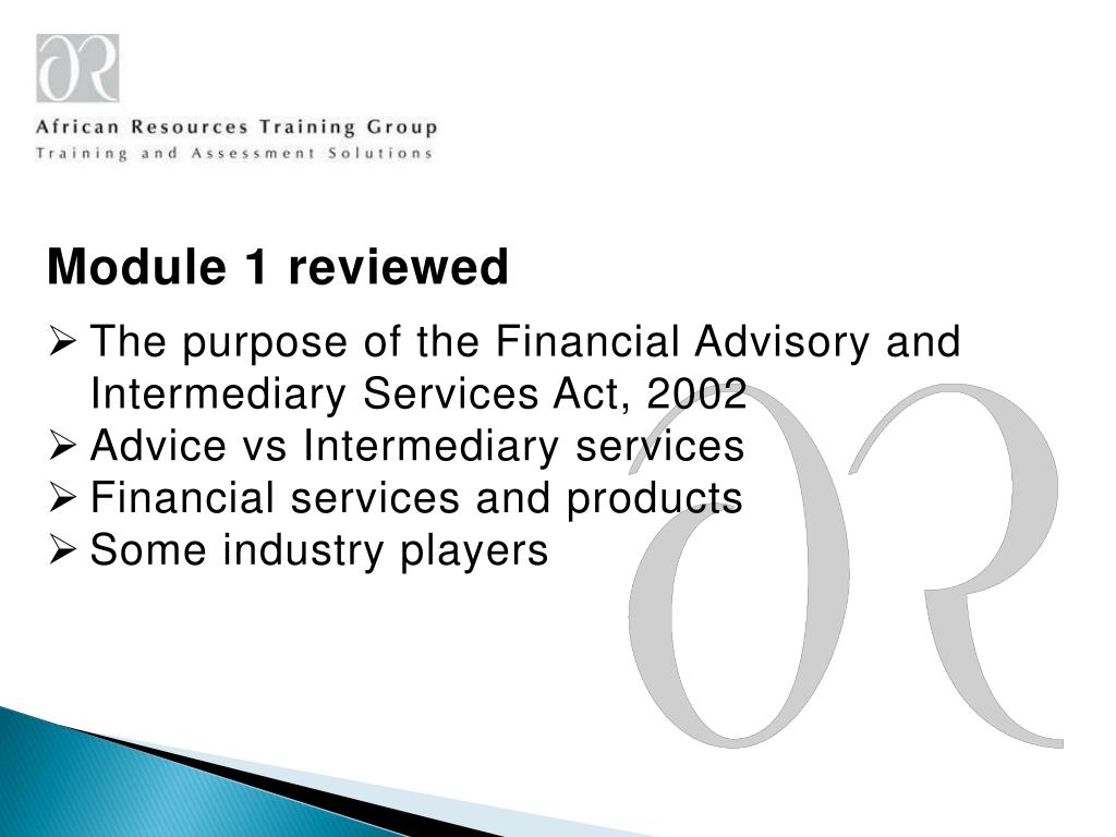 Module 1 reviewed • The purpose of the Financial Advisory and Intermediary Services Act, 2002 • Advice vs Intermediary services • Financial services and products • Some industry players
