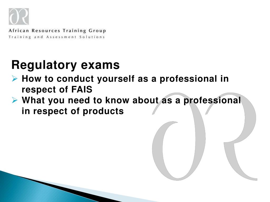 Regulatory exams • How to conduct yourself as a professional in respect of FAIS • What you need to know about as a professional in respect of products