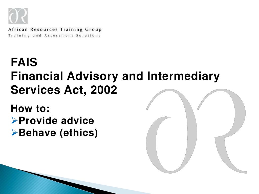 FAIS Financial Advisory and Intermediary Services Act, 2002 • How to: • Provide advice • Behave (ethics)