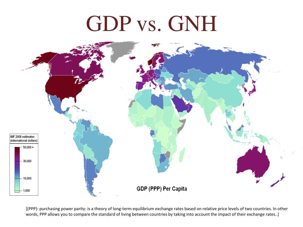 GDP vs. GNH [(PPP): purchasing power parity: is a theory of long-term equilibrium exchange rates based on relative price levels of two countries. In other words, PPP allows you to compare the standard of living between countries by taking into account the impact of their exchange rates..]