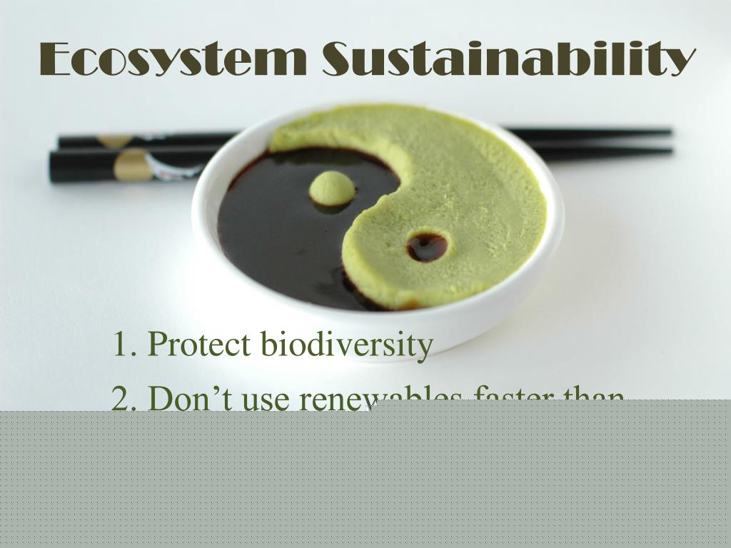 Ecosystem Sustainability 1. Protect biodiversity 2. Don’t use renewables faster than nature can replace them. 3. EmphasizeEcological Restoration