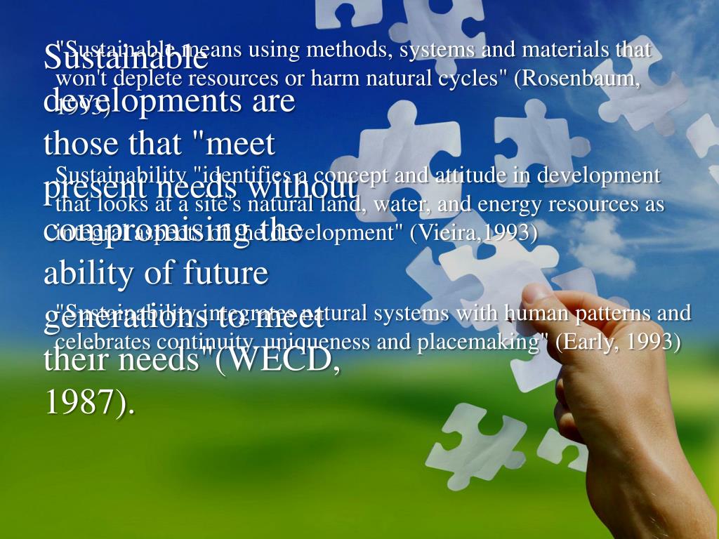 Sustainable developments are those that "meet present needs without compromising the ability of future generations to meet their needs"(WECD, 1987). "Sustainable means using methods, systems and materials that won't deplete resources or harm natural cycles" (Rosenbaum, 1993) Sustainability "identifies a concept and attitude in development that looks at a site's natural land, water, and energy resources as integral aspects of the development" (Vieira,1993) "Sustainability integrates natural systems with human patterns and celebrates continuity, uniqueness and placemaking" (Early, 1993)