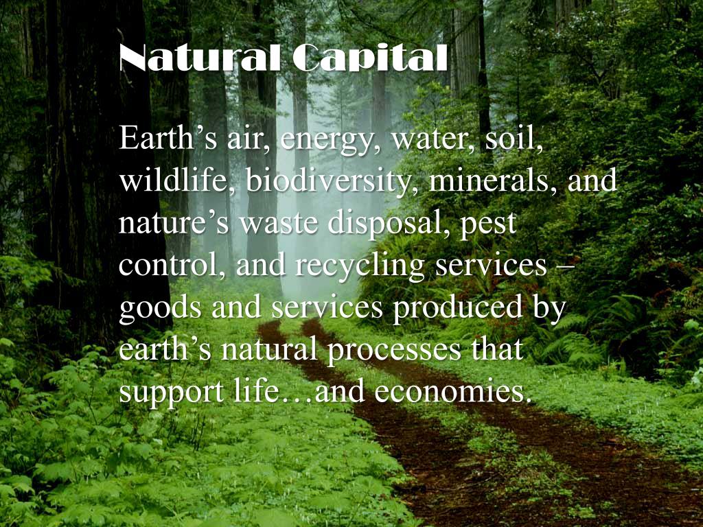 Natural Capital Earth’s air, energy, water, soil, wildlife, biodiversity, minerals, and nature’s waste disposal, pest control, and recycling services – goods and services produced by earth’s natural processes that support life…and economies.