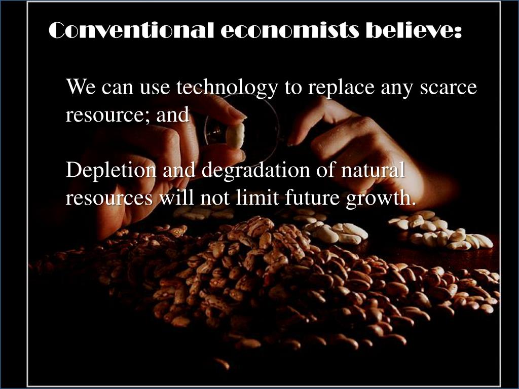 Conventional economists believe: We can use technology to replace any scarce resource; and Depletion and degradation of natural resources will not limit future growth.
