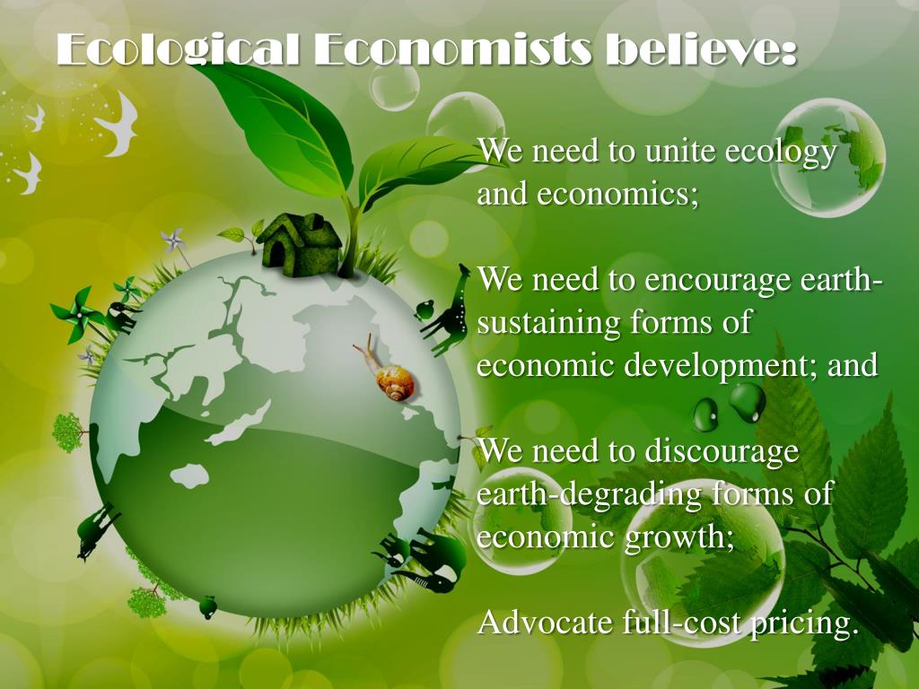 Ecological Economists believe: We need to unite ecology and economics; We need to encourage earth-sustaining forms of economic development; and We need to discourage earth-degrading forms of economic growth; Advocate full-cost pricing.