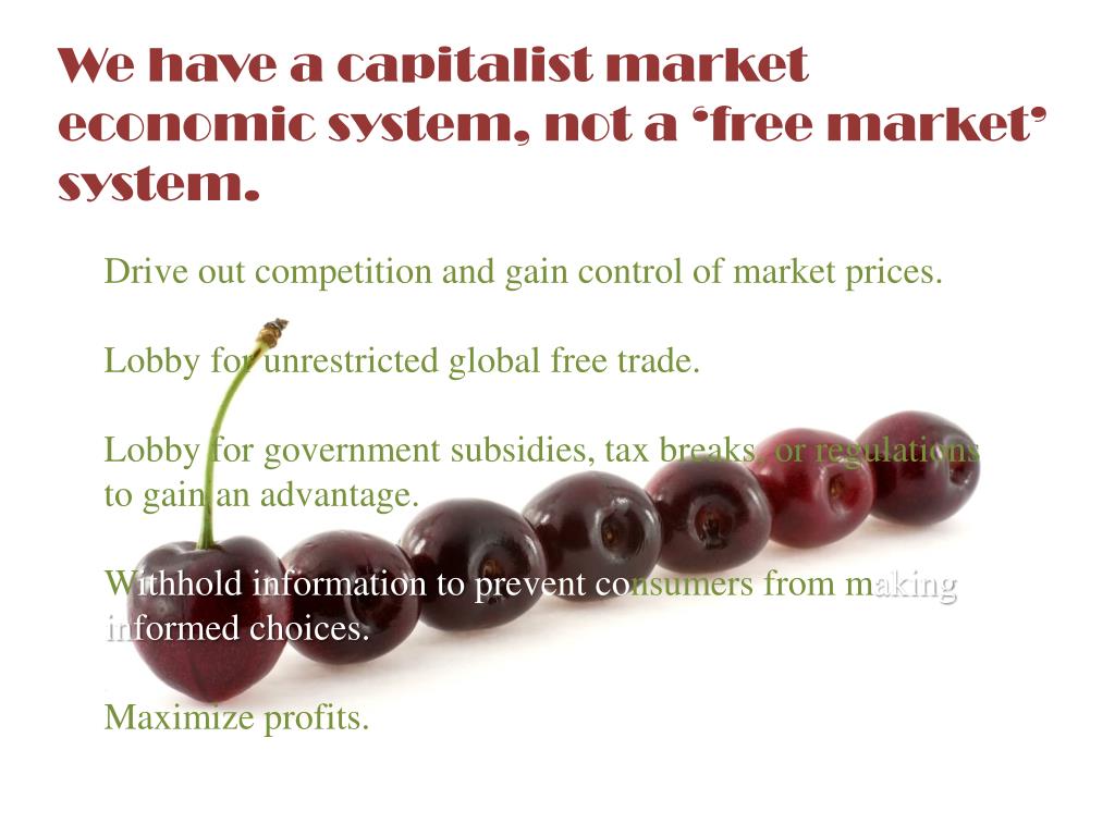We have a capitalist market economic system, not a ‘free market’ system. Drive out competition and gain control of market prices. Lobby for unrestricted global free trade. Lobby for government subsidies,tax breaks, or regulations to gain an advantage. Withhold information to prevent consumers from making informed choices. Maximize profits.