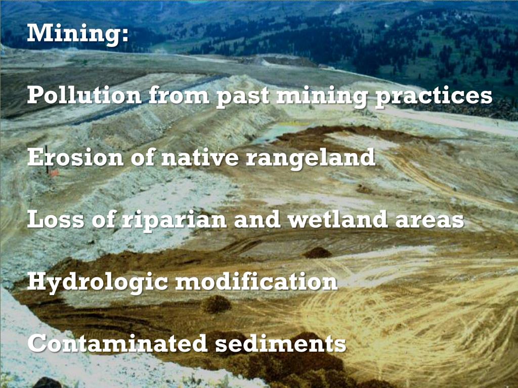 Mining: Pollution from past mining practices Erosion of native rangeland Loss of riparian and wetland areas Hydrologic modification Contaminated sediments