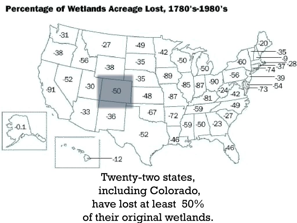 Twenty-two states, including Colorado, have lost at least 50% of their original wetlands.
