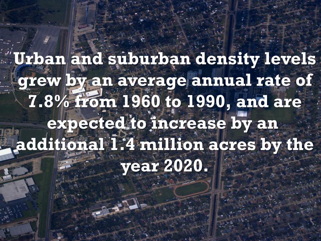 Urban and suburban density levels grew by an average annual rate of 7.8% from 1960 to 1990, and are expected to increase by an additional 1.4 million acres by the year 2020.