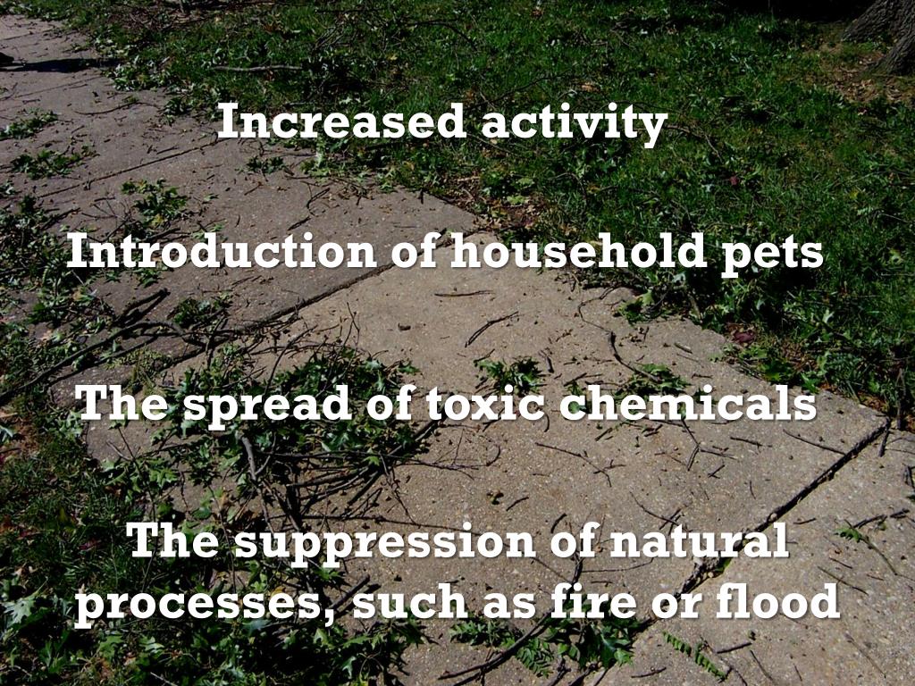 Increased activity Introduction of household pets The spread of toxic chemicals The suppression of natural processes, such as fire or flood