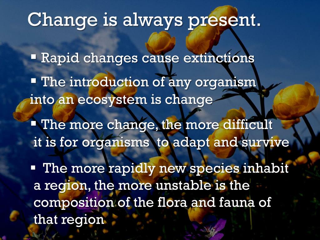 Change is always present. • Rapidchangescauseextinctions • The introduction of any organism • into an ecosystem is change • The more change, the more difficult • it is for organisms to adapt and survive • The more rapidly new species inhabit • a region, the more unstable is the • composition of the flora and fauna of • that region