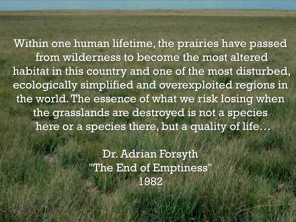 Within one human lifetime, the prairies have passed from wilderness to become the most altered habitat in this country and one of the most disturbed, ecologically simplified and overexploited regions in the world. The essence of what we risk losing when the grasslands are destroyed is not a species here or a species there, but a quality of life… Dr. Adrian Forsyth "The End of Emptiness" 1982