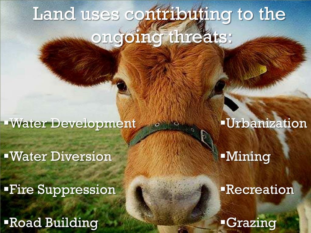 Land uses contributing to the ongoing threats: • Water Development • Water Diversion • Fire Suppression • Road Building • Urbanization • Mining • Recreation • Grazing