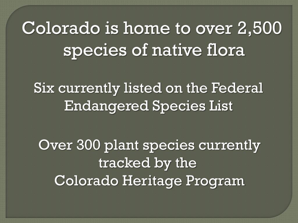 Colorado is home to over 2,500 species of native flora Six currently listed on the Federal Endangered Species List Over 300 plant species currently tracked by the Colorado Heritage Program