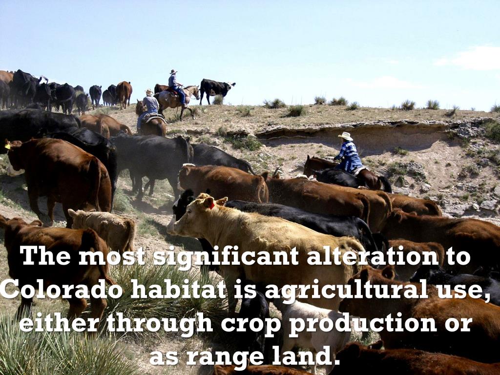 The most significant alteration to Colorado habitat is agricultural use, either through crop production or as range land.