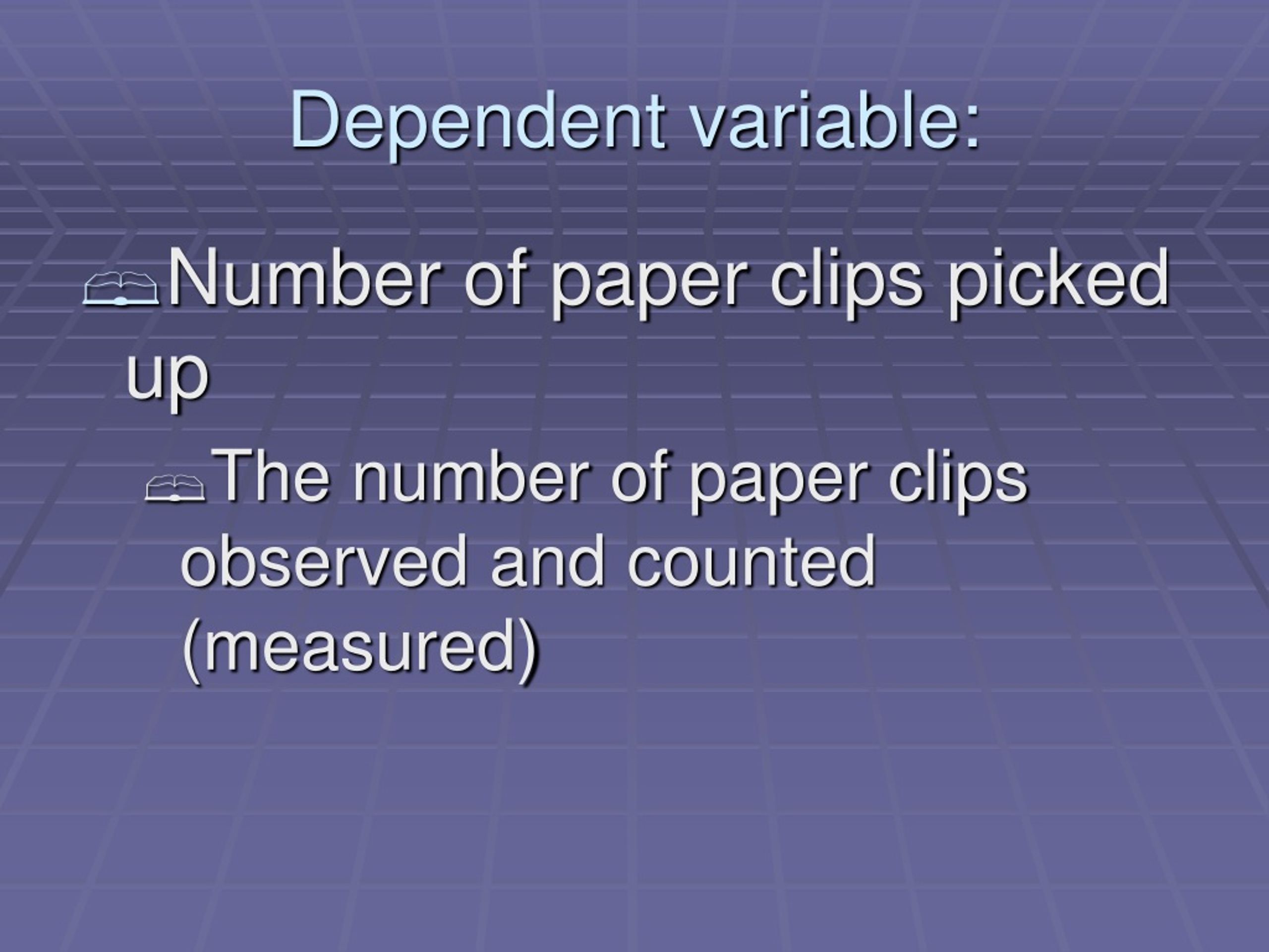 Dependent variable: • Number of paper clips picked up • The number of paper clips observed and counted (measured)