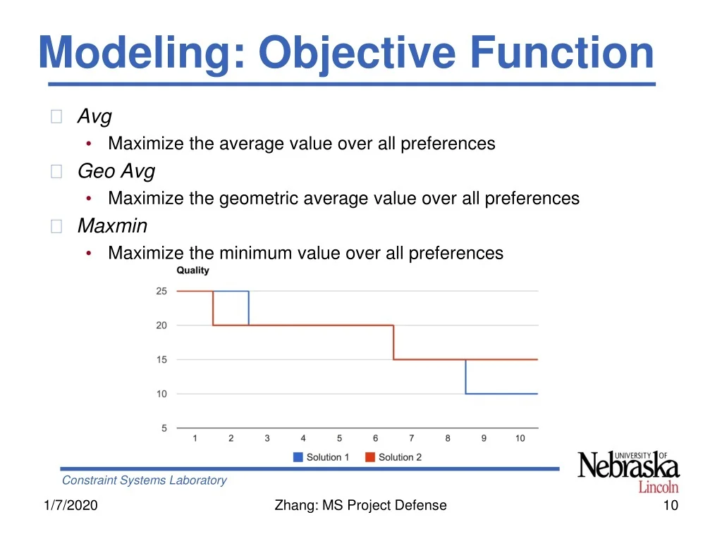 Modeling: Objective Function • Avg • Maximize the average value over all preferences • Geo Avg • Maximize the geometric average value over all preferences • Maxmin • Maximize the minimum value over all preferences Zhang: MS Project Defense