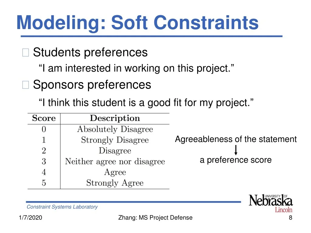 Modeling: Soft Constraints • Students preferences “I am interested in working on this project.” • Sponsors preferences “I think this student is a good fit for my project.” Agreeableness of the statement a preference score Zhang: MS Project Defense
