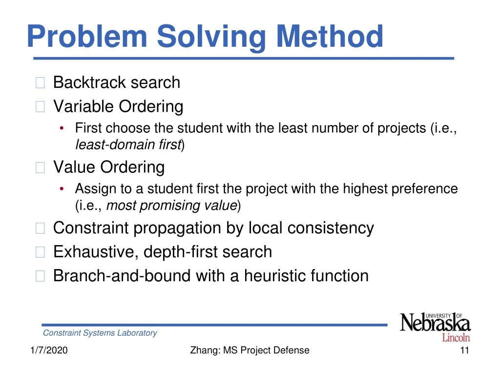Problem Solving Method • Backtrack search • Variable Ordering • First choose the student with the least number of projects (i.e., least-domain first) • Value Ordering • Assign to a student first the project with the highest preference (i.e., most promising value) • Constraint propagation by local consistency • Exhaustive, depth-first search • Branch-and-bound with a heuristic function Zhang: MS Project Defense