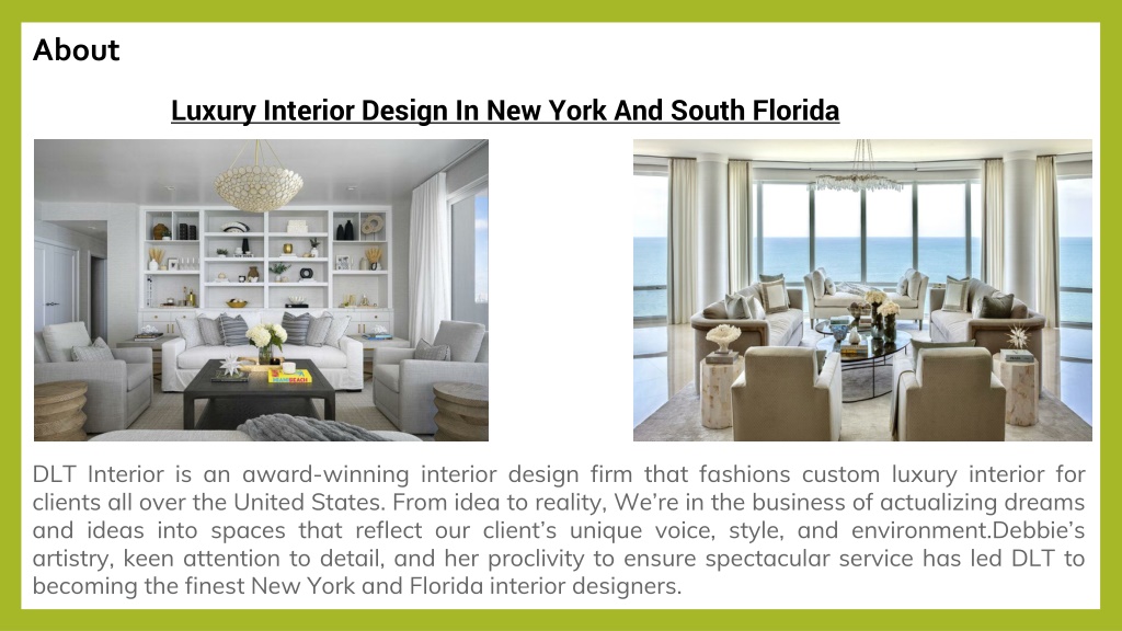 About Luxury Interior Design In New York And South Florida DLT Interior is an award-winning interior design firm that fashions custom luxury interior for clients all over the United States. From idea to reality, We’re in the business of actualizing dreams and ideas into spaces that reflect our client’s unique voice, style, and environment.Debbie’s artistry, keen attention to detail, and her proclivity to ensure spectacular service has led DLT to becoming the finest New York and Florida interior designers.