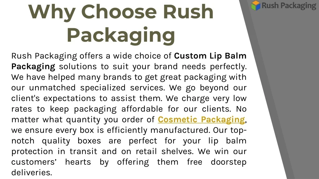 Why Choose Rush Packaging Rush Packaging offers a wide choice of Custom Lip Balm Packaging solutions to suit your brand needs perfectly. We have helped many brands to get great packaging with our unmatched specialized services. We go beyond our client's expectations to assist them. We charge very low rates to keep packaging affordable for our clients. No matter what quantity you order of Cosmetic Packaging, we ensure every box is efficiently manufactured. Our top-notch quality boxes are perfect for your lip balm protection in transit and on retail shelves. We win our customers’ hearts by offering them free doorstep deliveries.