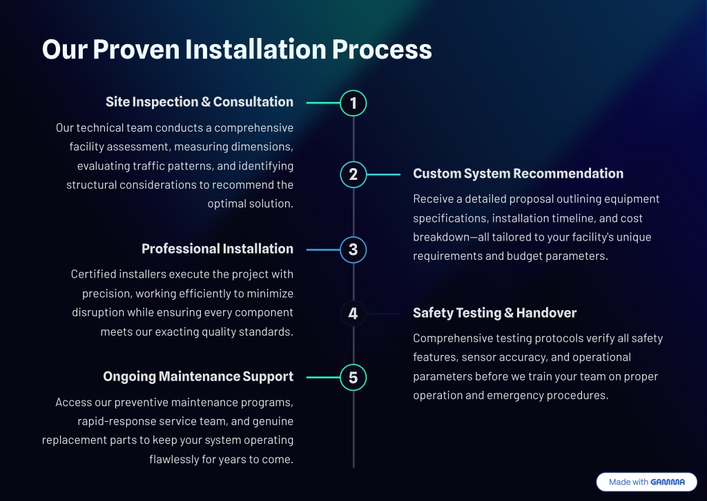Our Proven Installation Process 1 Site Inspection & Consultation Our technical team conducts a comprehensive facility assessment, measuring dimensions, evaluating traffic patterns, and identifying structural considerations to recommend the 2 Custom System Recommendation Receive a detailed proposal outlining equipment specifications, installation timeline, and cost breakdown4all tailored to your facility's unique requirements and budget parameters. optimal solution. 3 Professional Installation Certified installers execute the project with precision, working efficiently to minimize disruption while ensuring every component meets our exacting quality standards. 4 Safety Testing & Handover Comprehensive testing protocols verify all safety features, sensor accuracy, and operational parameters before we train your team on proper operation and emergency procedures. 5 Ongoing Maintenance Support Access our preventive maintenance programs, rapid-response service team, and genuine replacement parts to keep your system operating flawlessly for years to come.