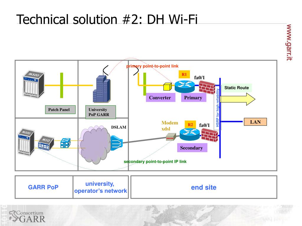 Technical solution #2: DH Wi-Fi primary point-to-point link R1 fa0/1 Static Route Converter Primary HSRP for high reliability Patch Panel University PoP GARR Modem xdsl LAN R2 fa0/1 DSLAM Secondary secondary point-to-point IP link GARR PoP university, operator’s network end site