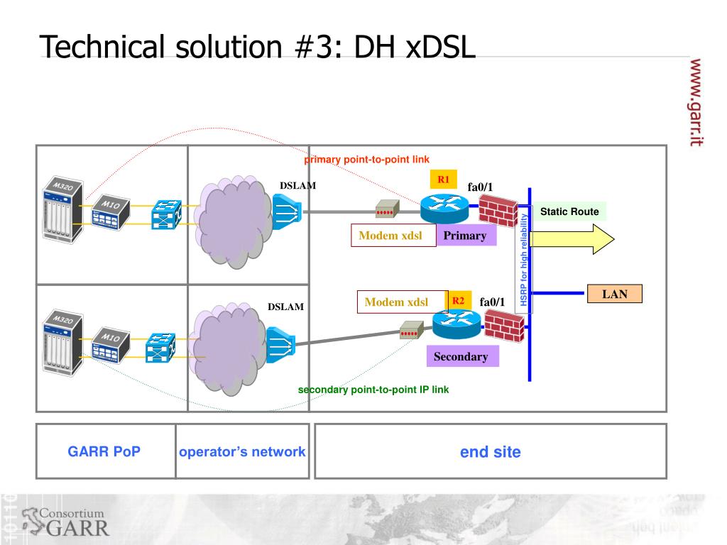 Technical solution #3: DH xDSL primary point-to-point link R1 DSLAM fa0/1 Static Route Modem xdsl Primary HSRP for high reliability LAN Modem xdsl R2 fa0/1 DSLAM Secondary secondary point-to-point IP link GARR PoP operator’s network end site