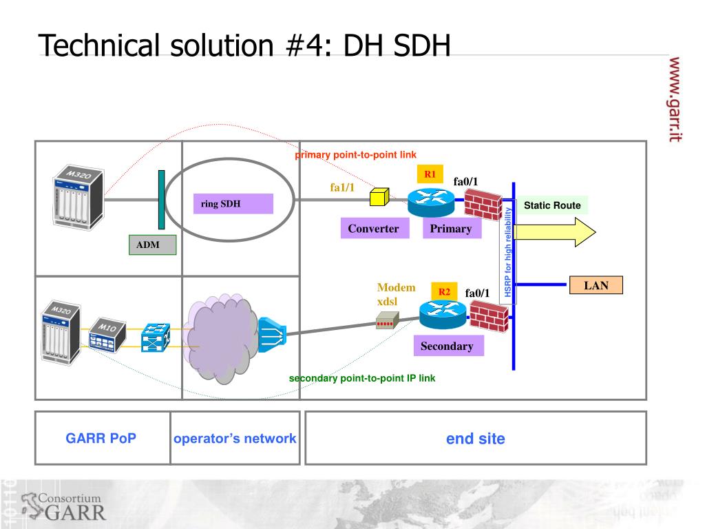 Technical solution #4: DH SDH primary point-to-point link R1 fa0/1 fa1/1 ring SDH Static Route Converter Primary ADM HSRP for high reliability Modem xdsl LAN R2 fa0/1 Secondary secondary point-to-point IP link GARR PoP operator’s network end site