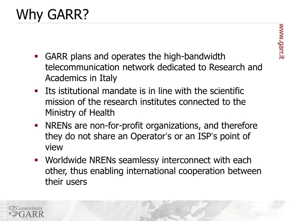 Why GARR? • GARR plans and operates the high-bandwidth telecommunication network dedicated to Research and Academics in Italy • Its istitutional mandate is in line with the scientific mission of the research institutes connected to the Ministry of Health • NRENs are non-for-profit organizations, and therefore they do not share an Operator’s or an ISP’s point of view • Worldwide NRENs seamlessy interconnect with each other, thus enabling international cooperation between their users