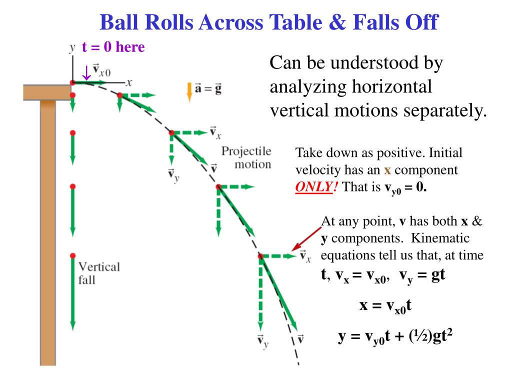 Ball Rolls Across Table & Falls Off t = 0 here Can be understood by analyzing horizontal vertical motions separately. Take down as positive. Initial velocity has an x component ONLY! That is vy0 = 0. At any point, v has both x & y components. Kinematic equations tell us that, at time t, vx = vx0, vy = gt x = vx0t y = vy0t + (½)gt2