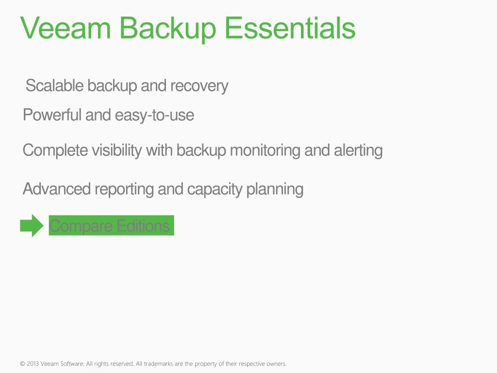 Veeam Backup Essenitals Protecting your customers' investments Powerful, easy-to-use and affordable Complete visibility with backup monitoring and alerting Advanced reporting and capacity planning Compare Editions