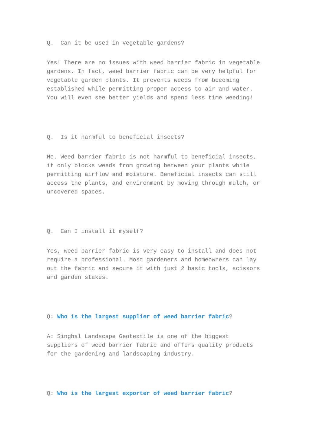 Q. Can it be used in vegetable gardens? Yes! There are no issues with weed barrier fabric in vegetable gardens. In fact, weed barrier fabric can be very helpful for vegetable garden plants. It prevents weeds from becoming established while permitting proper access to air and water. You will even see better yields and spend less time weeding! Q. Is it harmful to beneficial insects? No. Weed barrier fabric is not harmful to beneficial insects, it only blocks weeds from growing between your plants while permitting airflow and moisture. Beneficial insects can still access the plants, and environment by moving through mulch, or uncovered spaces. Q. Can I install it myself? Yes, weed barrier fabric is very easy to install and does not require a professional. Most gardeners and homeowners can lay out the fabric and secure it with just 2 basic tools, scissors and garden stakes. Q: Who is the largest supplier of weed barrier fabric? A: Singhal Landscape Geotextile is one of the biggest suppliers of weed barrier fabric and offers quality products for the gardening and landscaping industry. Q: Who is the largest exporter of weed barrier fabric?