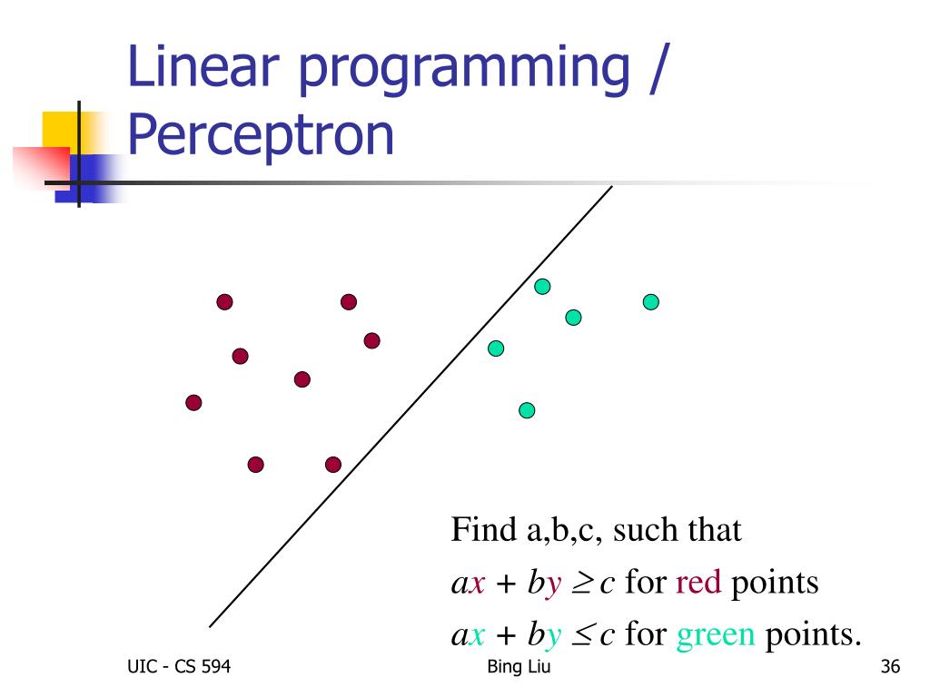 Linear programming / Perceptron Find a,b,c, such that ax + by c for red points ax + by c for green points. Bing Liu