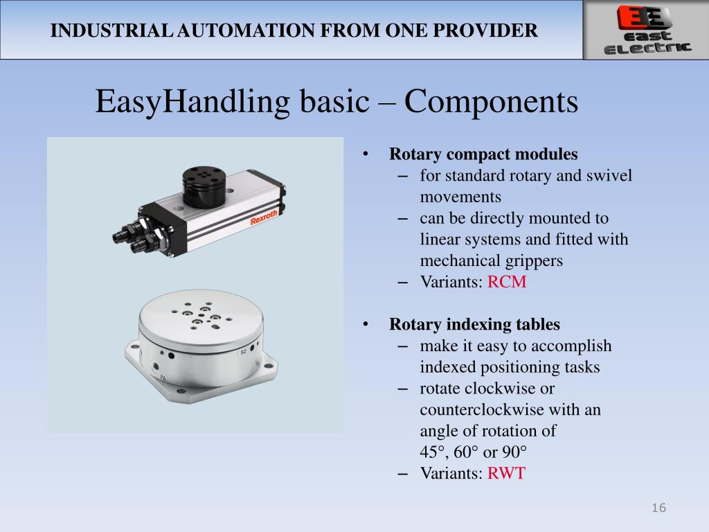INDUSTRIAL AUTOMATION FROM ONE PROVIDER EasyHandling basic – Components • Rotary compact modules • for standard rotary and swivel movements • can be directly mounted to linear systems and fitted with mechanical grippers • Variants: RCM • Rotary indexing tables • make it easy to accomplish indexed positioning tasks • rotate clockwise or counterclockwise with an angle of rotation of 45°, 60° or 90° • Variants: RWT